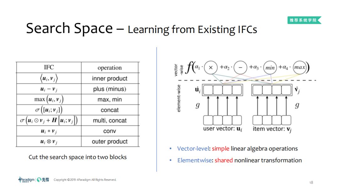 那么怎样设计一个合理的AutoML呢,学习已有算法的长处并弥补他们的短处。左边的就是交互函数,会有加减操作以及简单的向量级别的相关操作,如向量的加减法、串并联、卷积等操作,基于这样的观察,就有了右图,可以看出交互函数有两类元素的操作:vector-level及elementwise: