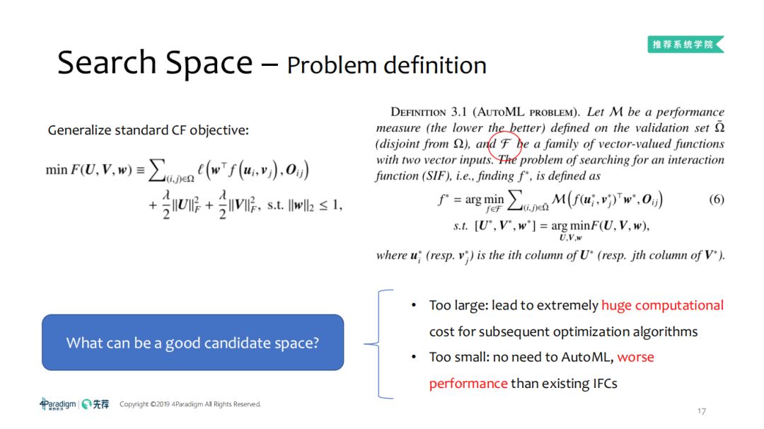 )替代,w是权重。这个过程,参数在验证集上的验证效果,下一层是训练集上拿到一个嵌入,这是一个比较标准的协同滤波背景下的自动化机器学习。那么怎样设计一个搜索空间呢,如果太大会导致很高很高的搜索计算代价,例如在一百维空间要比一维空间搜索的代价高的多,且随着搜索空间的增大搜索代价成指数级的放大;搜索空间太大不可以,同样的,太小也不可以,太小就不需要自动化机器学习,而且效果要比已存在的交互函数更差。