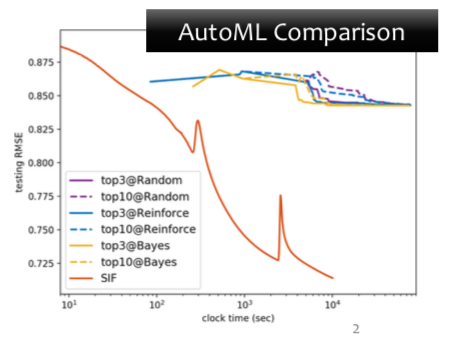 SIF、SIF(no-auto)比AutoML算法(如经典的Random算法、Reinforce算法、Bayes算法)等效果好,大致快2个阶: