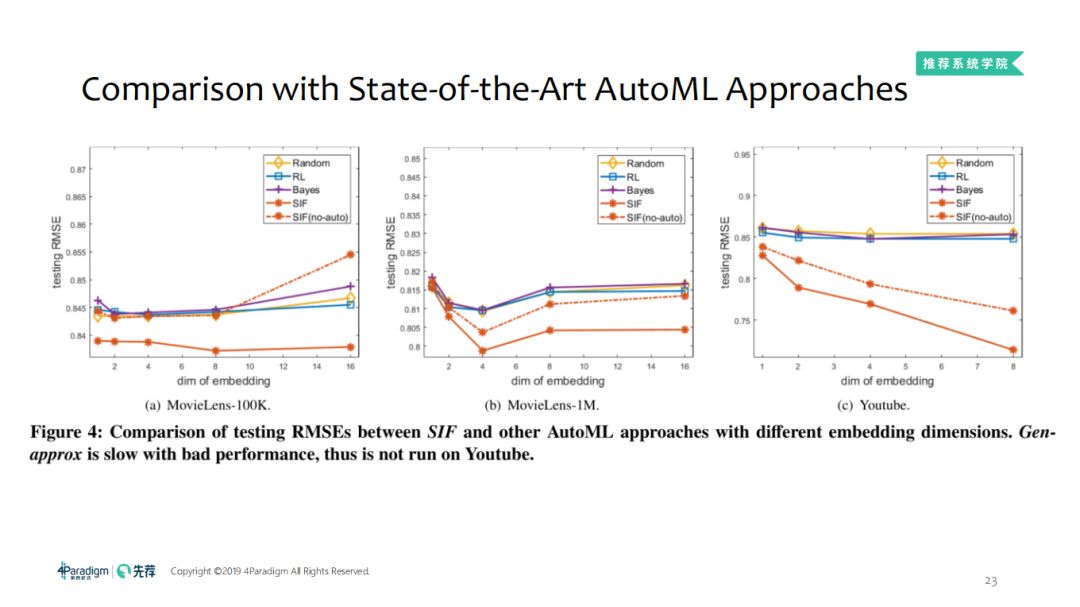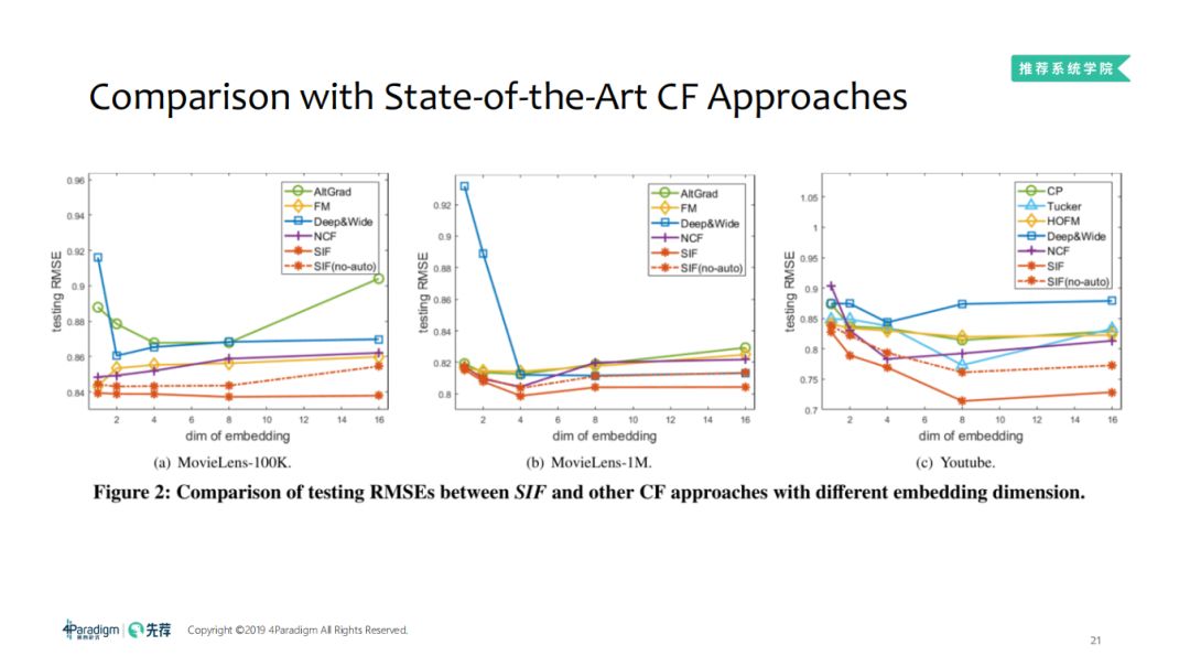 ① 通过不同的embedding维度,对比SIF及其他的CF方法测试集上的RMSE,可以看到SIF、SIF(no-auto)表现出了很好的优势。