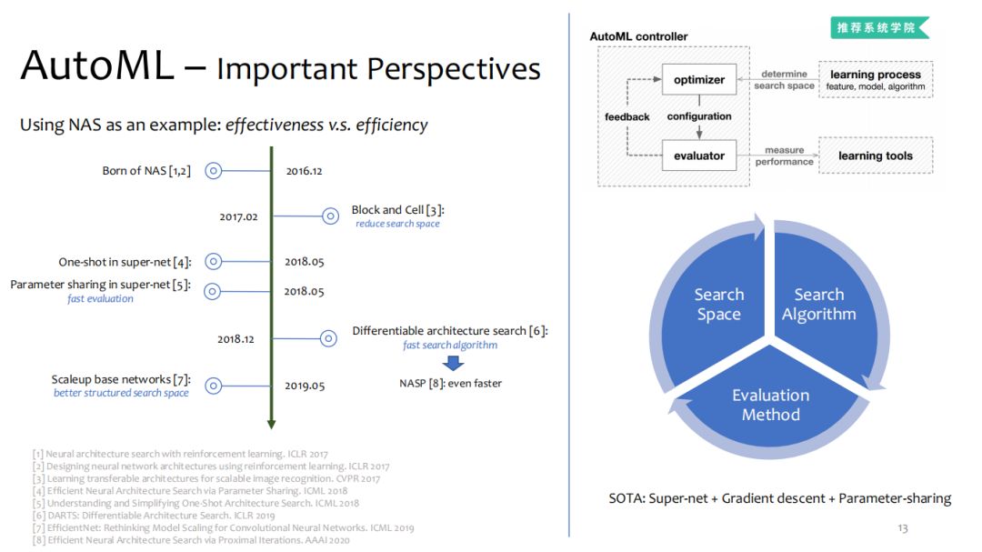 NAS最初是缩小搜索空间,以此缩短搜索时间,提高搜索效率。下一步是改善评价方法,由标准的stand-alone 转变成参数共享。这样就在搜索空间、搜索算法、评价方法这个闭环中完成了NAS三个侧面的一次循环。