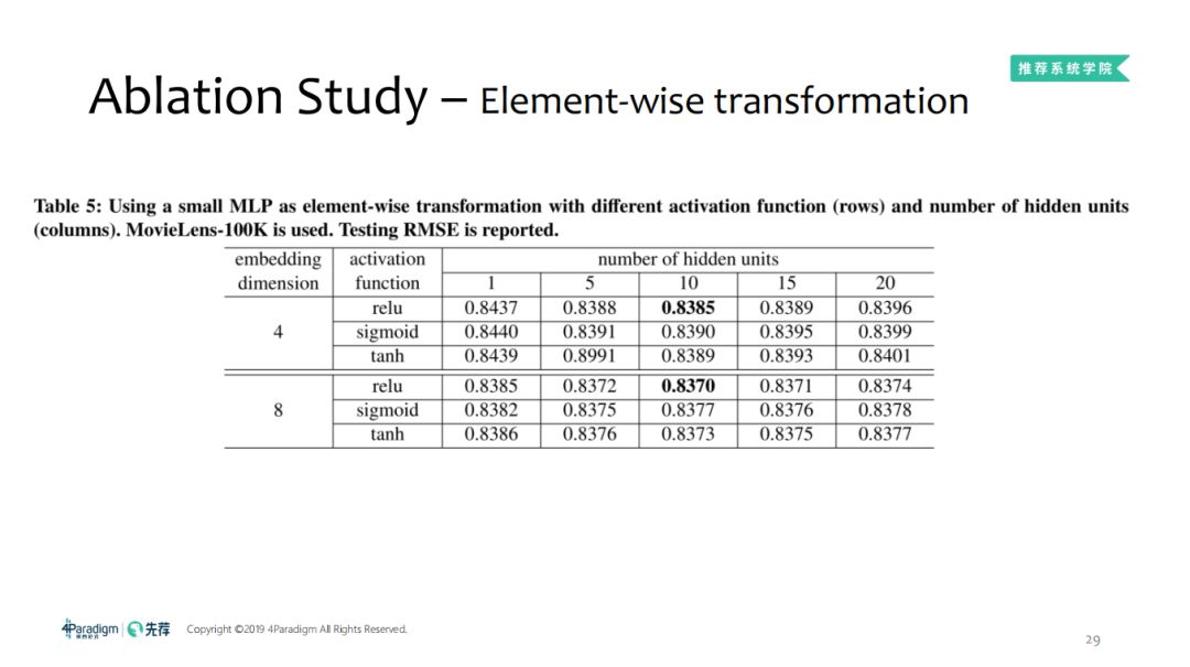 在MovieLens-100K数据集上,对于测试集上的RMSE结果如下表:当隐藏单元数量为10的时候,对于不同的激活函数取得的效果基本相差不大,我们需要的是简单的非线性函数,而不是复杂度特别高的函数。