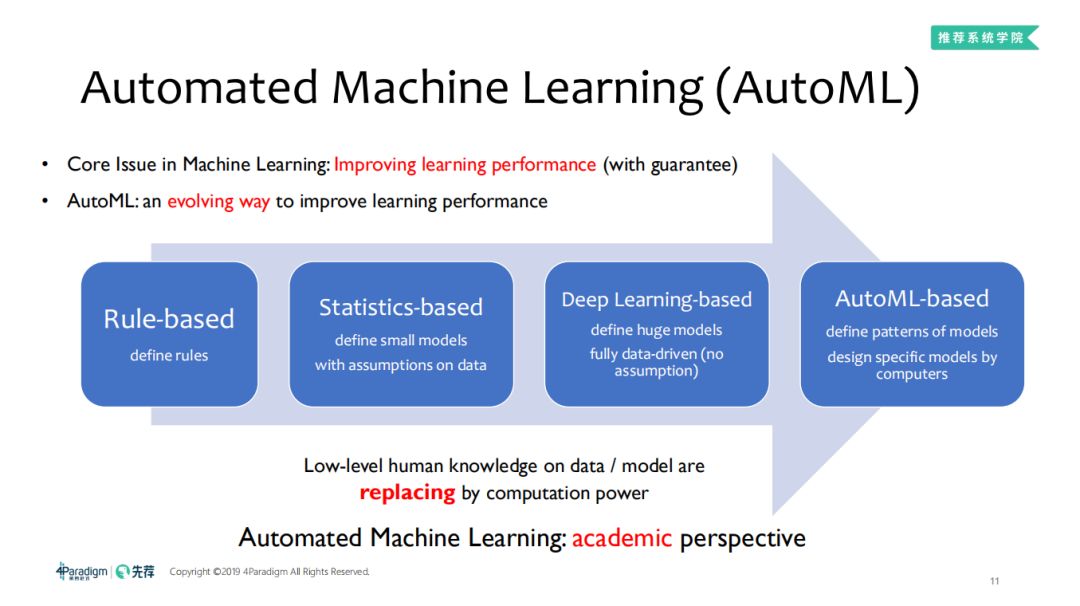 研究交互函数,我们就需要纵观整个自动化机器学习的发展。接下来我们一起从学术角度回顾自动化机器学习,自动化机器学习在机器学习中摆在什么位置呢?