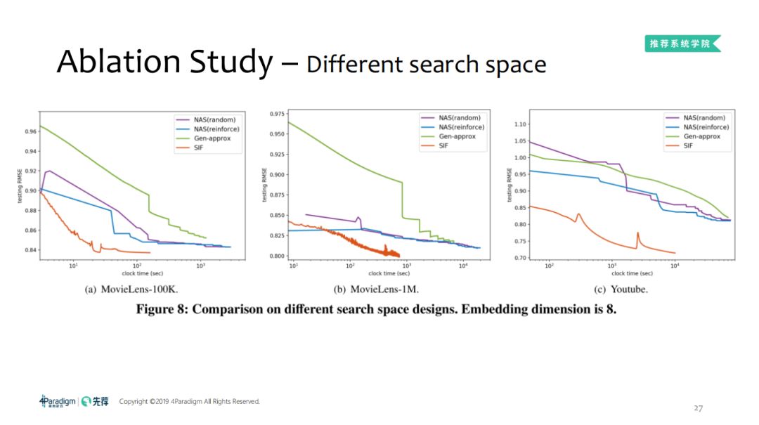 看过整体效果,接下来我们看下细节刻画,首先,搜索空间除了MLP可以放过来,我们也可以在标准的MLP嵌入SIF,图中可以看出,在相对宽泛的数据空间,利用空间还是相对较低的,SIF会明显的快很多。如果增加更多的算法运算,效果会好,MLP越多,100K的数据集上设计了不同的嵌入维度以及激活函数的类型,隐藏层到10左右效果就差不多了,不同的算法区别不大,因为只是拟合一个比较简单的非线性函数,不需要过高的复杂度。