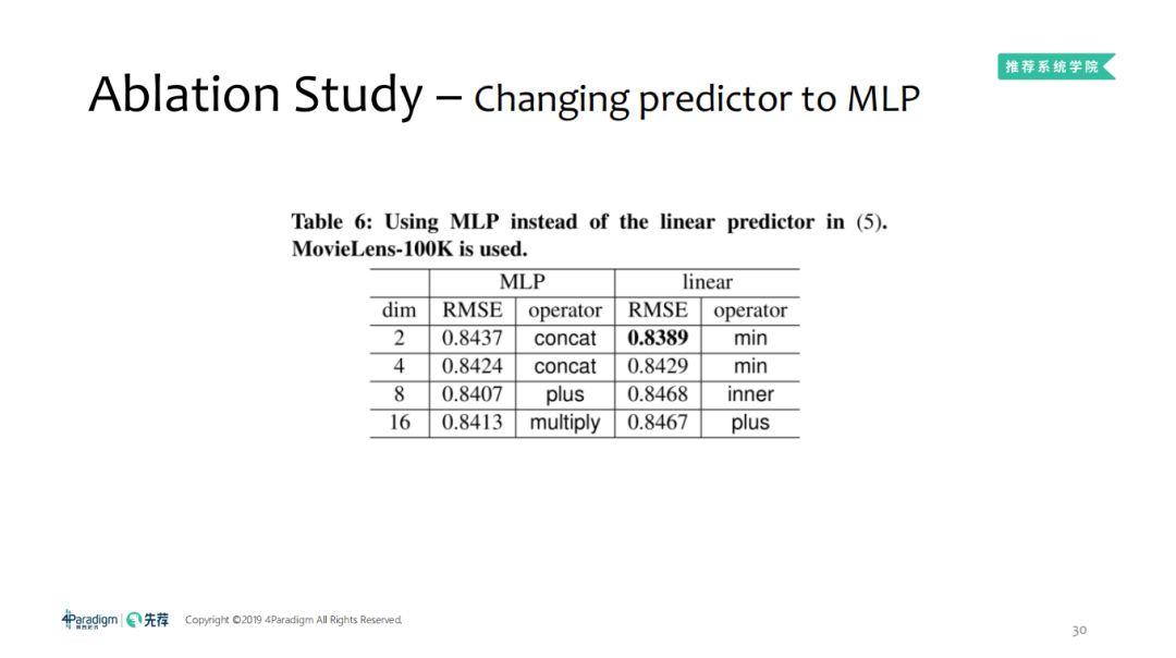 将线性的predictor换成非线性的MLP后,fine-tune的难度会变得更大,复杂度更高,对于在MovieLens-100K数据集上运用MLP替代线性预测器的效果如下,可以看到在该数据集上linear的效果比较好。