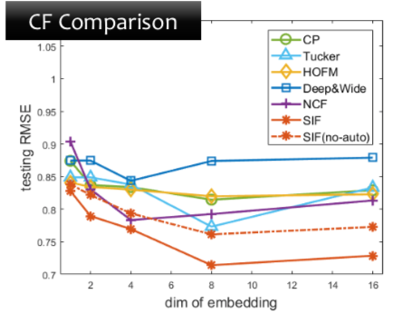 SIF、SIF(no-auto)比常见的协同过滤方法(如CP、Tucker、HOFM、Deep&Wide、NCF等方法)得到更好的效果: