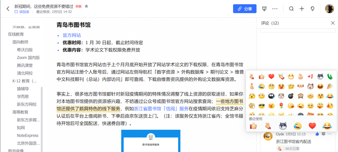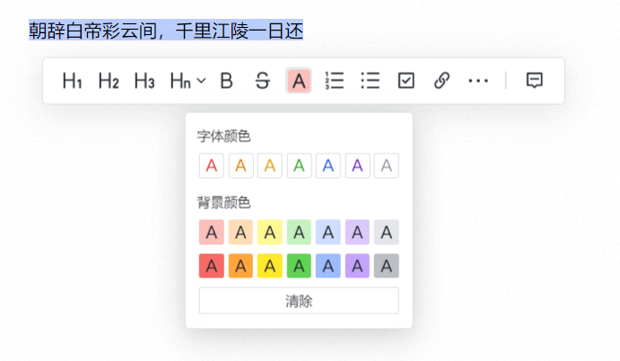 飞书文档则是一款足够好用的实时协作编辑器。除了上文提到的划线评论、表情回复等,它对于格式的限制恰巧体现了产品团队的克制。飞书文档支持基本的对齐方式、删除 / 下划线、粗体斜体外,对于文本的高亮则内置了好看、适合屏幕显示的颜色,让深入处理内容时的高亮操作更加便捷高效。