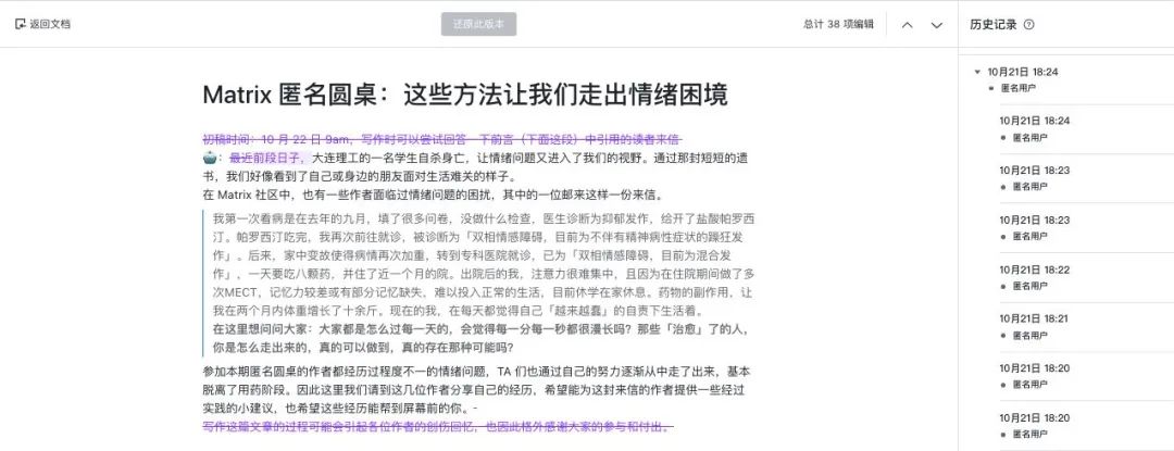 使用飞书进行约稿更是编辑部的日常。编辑 @会飞的三羊店长 经常组织圆桌活动,在这个场景下,飞书精细的权限控制则格外地好用。飞书文档可以将编辑权限打开到「网络上所有获取链接的人都可编辑」,即便将链接给到未注册飞书账户的用户,对方也可以直接编辑,没有注册压力;另外,未注册用户会以「访客」身份登录,这也可以满足「匿名写作」等特殊写作场景的需求。