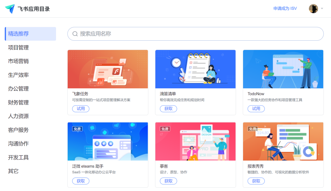 作为企业的中心平台,飞书将各类内外部应用连接起来。在它的开放平台上,有官方的邮件、服务台、审批等应用,也有第三方开发的看板、计划应用,类似于 CRM、ERP 等大型应用也可以轻松地添加到企业平台上,给各类平台提供一个统一的入口。企业还可以自己发布应用,实现混合云的变革。