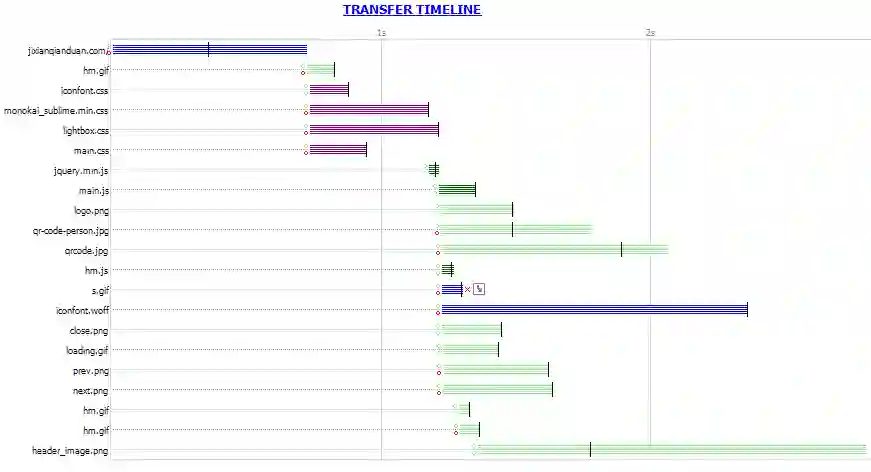 图2为使用Fiddler获取浏览器访问地址 http://www.jixianqianduan.com 时的资源加载时序图。根据此图,我们可以很直观地看到页面上各个资源加载过程所需要的时间和先后顺序,有利于找出加载过程中比较耗时的文件资源,帮助我们有针对性地进行优化。