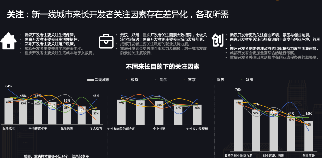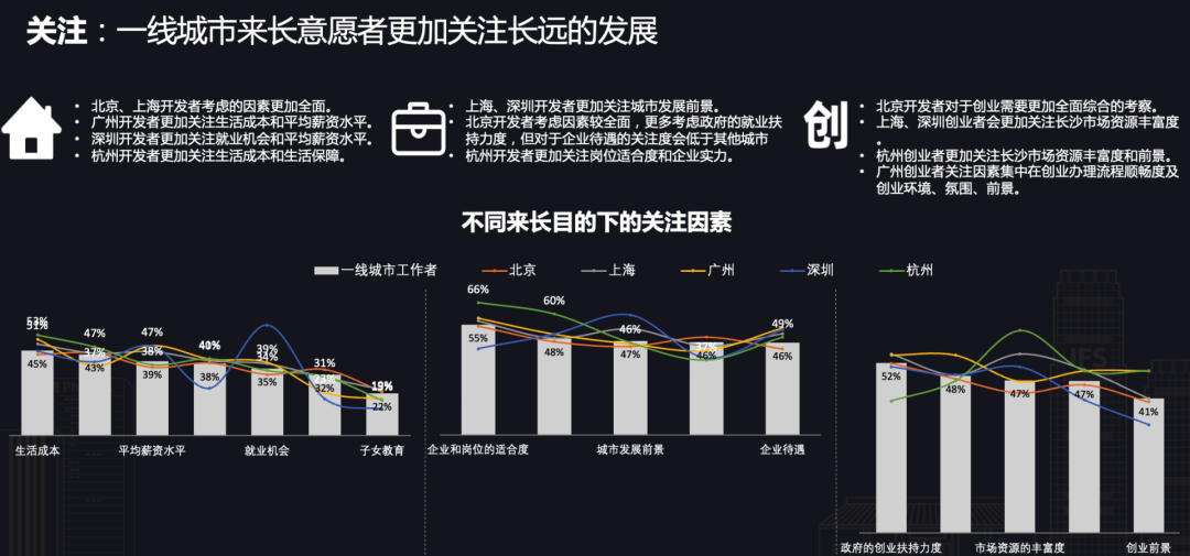 另外,新一线城市来长开发者的关注因素上也存在差异化,表现为一种各取所需的趋势。