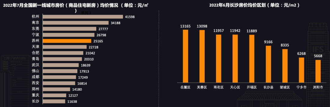 据前瞻产业研究院统计显示,2022 年 7 月,在全国新一线城市中长沙房价均价为每平米 11638 元,远低于杭州的 41598 元,位于最低房价排名的前位。