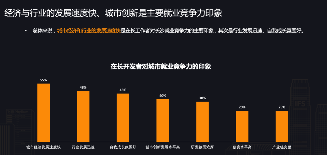 报告显示,多数开发者对长沙就业竞争力的印象为“城市发展快、自我成长氛围好、城市创新高”等。也有部分开发者认为在新一线城市、尤其是中部城市中,长沙的薪资水平和产业链处于较领先的地位。