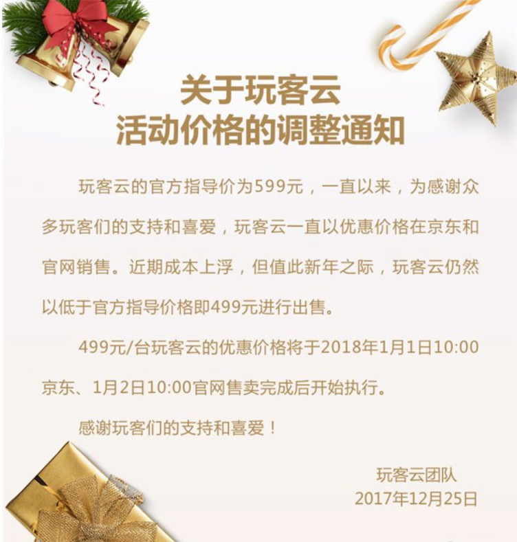 IT之家消息,12月25日消息,迅雷玩客云发布关于玩客云活动价格的调整通知,官方表示,玩客云的官方指导价为599元,近期成本上浮,499元/台玩客云的优惠价格将于2018年1月1日10:00京东、1月2日10:00官网售卖完成后开始执行。