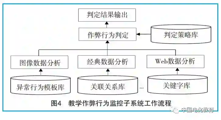 教学作弊行为监控子系统工作流程如图4所示。作弊行为的判断所采用的三种数据源之间相互辅佐,相互支撑,为最终作弊行为的判定起到了相互印证的作用。系统最终的判定取决于三种数据源分析结果的综合。系统中维护了判定策略库、关键字库、异常行为模板库、关联关系库等多个相关数据库,分别支撑不同的数据源的挖掘判定。最终系统根据三种数据源的分析结果进行综合,利用策略库中提供的策略方案实现作弊行为的判定输出。