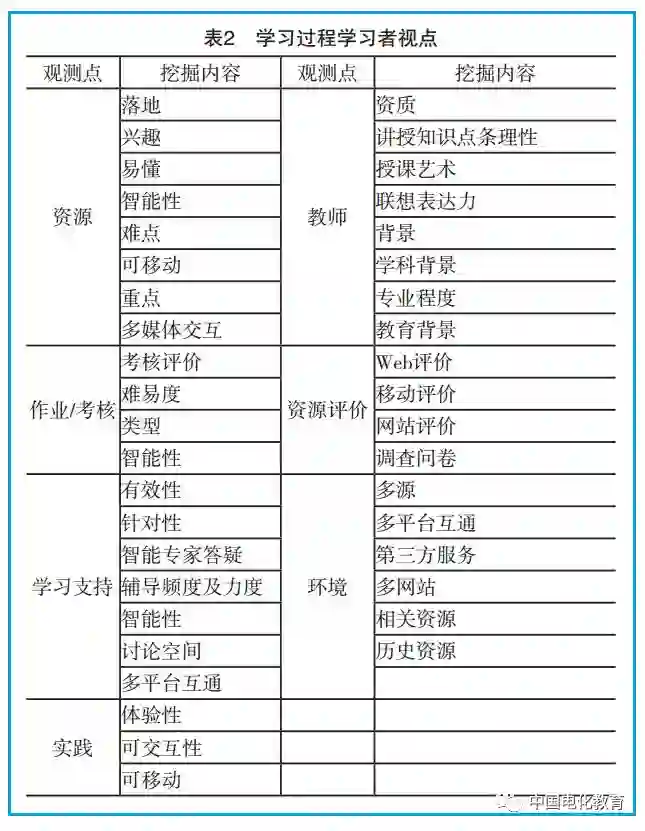 表2所示为远程学习过程中学习者视点示意表。从学习者的角度看待教学,他们所关心的问题包括资源质量、教师质量、作业/考核、教学环境、资源评价、实践环境和学习支持。根据这些模块中所涉及的信息特征,系统可以分别去挖掘相关的数据为学习者的学习提供有效的支持。