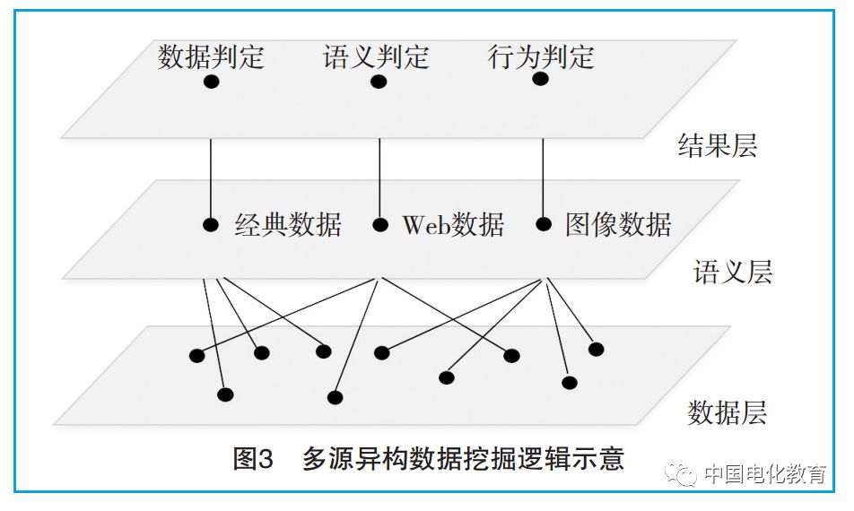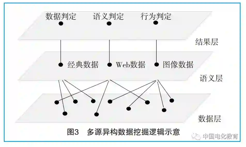 基于教学视点确定了数据挖掘方向和挖掘区域之后,本团队展开了针对多源异构教育数据的挖掘方法研究,图3所示为多源异构数据挖掘的逻辑示意图。挖掘过程共分为三层,底层的数据层是多来源多形态的数据集合,可以是结构化、半结构化或非结构化的数据,这些数据经过语义层的分析,进行不同的归类,为进一步的挖掘做好准备。结果层针对不同的数据类型采用相应的方法实现数据结果的判定。