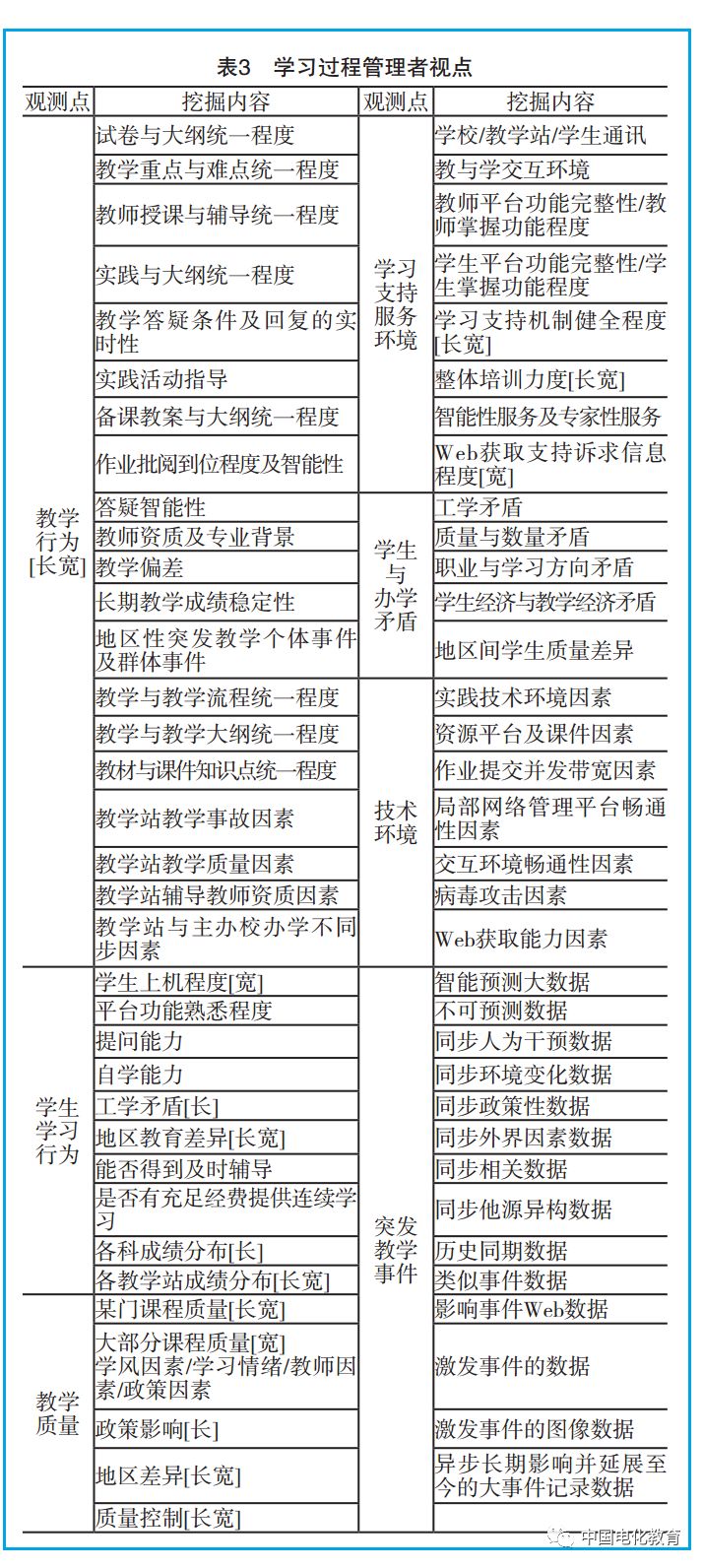 教学视点是观察教学问题的角度和视野,教学视点决定了解决教学问题的态度和措施,因此教学视点的方向和广域度将直接决定教学自身的态度。教学视点分为广域视点和局域视点。广域视点是站在管理者的角度实现的教学过程调控、教学质量提升、教学能力提高、课程资源优化、教学效果推动等,而局域视点则更加着眼于具体的教学过程的控制,如考试环节、授课环节、实践环节、毕设环节等。远程教学视点是一种多源多方向的教育视点,从提升教学质量出发,站在教学系统不同角色的角度,对教学数据挖掘的方向和挖掘的区域的进行了界定,为数据挖掘的开展提供了明确的目标。