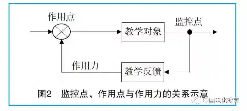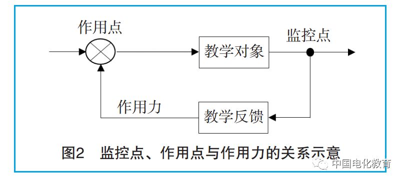 作用点是对监控的问题进行应力的施加点,它位于监控点之后。系统根据不同的教学监控点获得相关信息,对于呈现的与标准不一致的问题进行相应调整,调整的程度决定了系统中反馈的作用力的大小。作用点作用在何处因问题而异,它与动作行为的滞前滞后有很大关系,即与延迟行为、组织行为、反馈速度、观测点产生的影响有关系。多数教学的作用点应该是对原来执行教学过程反馈后回到起始点开始进行修正。作用点上施加的应力或采取的策略叫做作用力,监控点、作用点与作用力的关系示意图可以借鉴工业控制模型表达为如图2所示的形式。