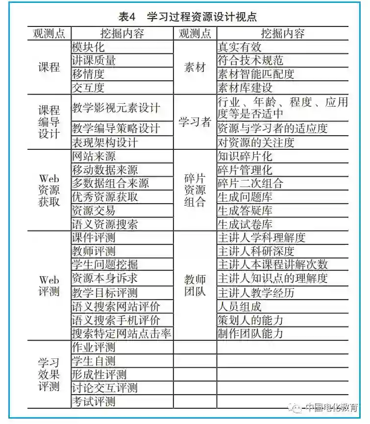 教学资源是教学质量的重要组成部分,资源设计的质量直接决定了学生的学习兴趣度、学习深入度和学习效果[14]。下页表4所示为学习过程资源设计视点示意表,呈现了资源设计中相关的事件及影响因素。优秀的学习资源应该具备良好的开发团队,不仅要从内容上与教学大纲知识点相吻合,更需要注重资源效果的展示。远程的网络教学中,教学资源是教学的命脉,除了教师要具备良好的教学素质之外,资源是否能够吸引学生是提高他们对课程关注和学习的重要环节,因此,课程的编导比传统教学方式显得更为重要[15]。要将教师对知识和学科的理解融入教学资源设计中,加入影视资源设计的理念,针对不同层次的学习者设计不同风格和类型的资源,要能对资源进行碎片化管理[16],使学生可以根据个人的关注度对资源进行自由裁剪,要扩展资源的获取手段和方式,利用先进的技术从网络中不断获取最新的教学资源。资源使用效果的评价是资源设计的重要反馈环节,通过学习者对资源不同渠道、多种方式的反馈,可以实现对资源的不断修正,从而达到资源质量的最优控制。