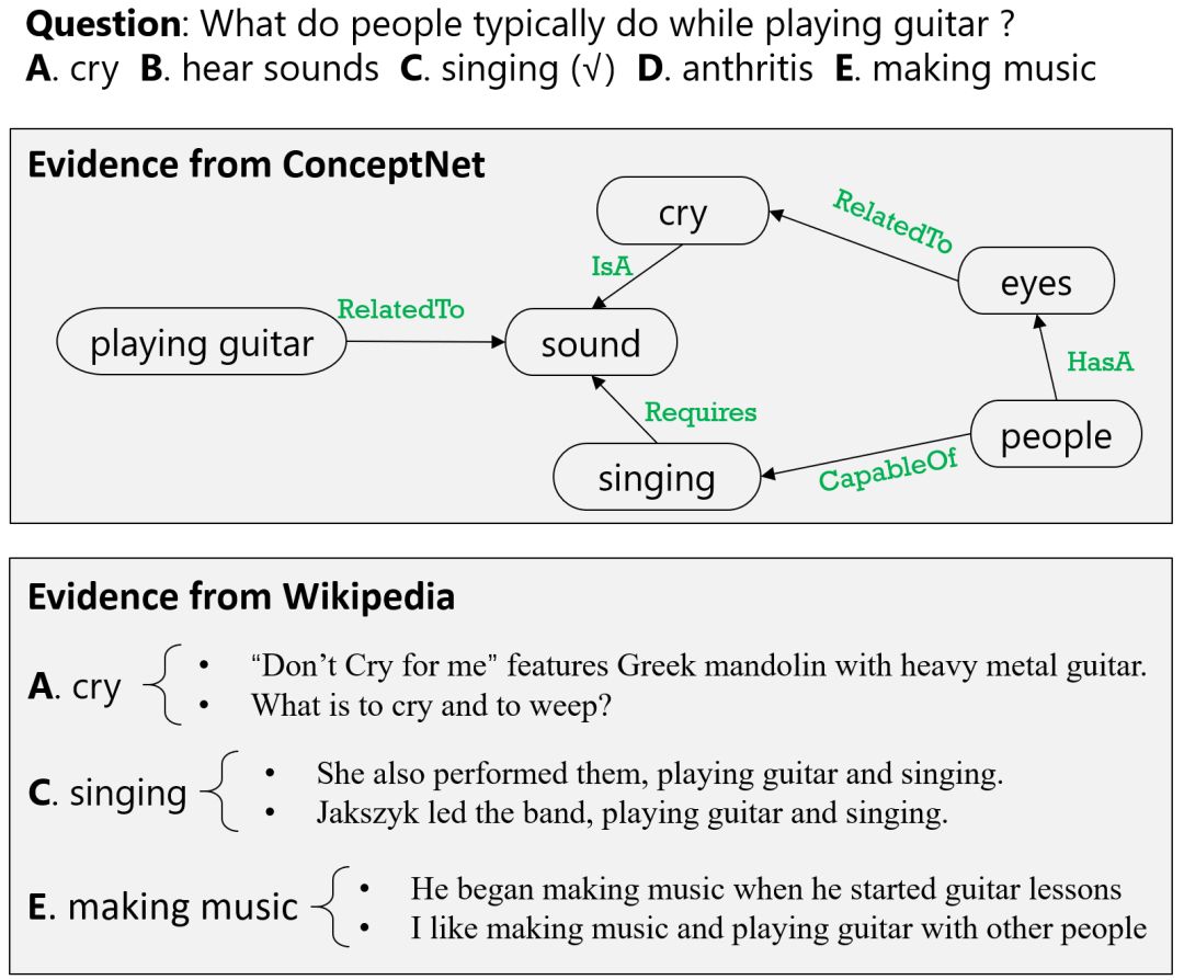 具体地,我们同时利用结构化常识知识库 ConceptNet 和 Wikipedia 文档。