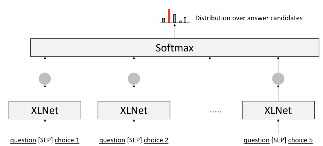 首先利用 XLNet[5] 预训练模型计算问题和每个候选答案的语义相关程度,然后使用 softmax 层计算各个候选答案正确的概率。