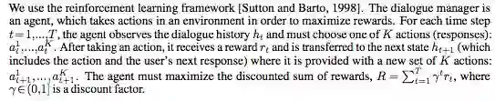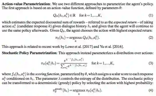 There are 22 response models in the system, including neural network based retrieval models, neural network based generative models, knowledge base question answering systems and template-based systems. Examples of candidate model responses are shown in Table 1 along with the model names. For a description of these models, the reader is referred to the technical report by Serban et al. [2017]. 4 Model Selection Policy After generating the candidate response set, the dialogue manager uses a model selection policy to select the response it returns to the user. The dialogue manager must select a response which increases the satisfaction of the user for the entire dialogue. In order to do this, it must make a trade-off between immediate and long-term user satisfaction. For example, suppose the user asks to talk about politics. If the dialogue manager chooses to respond with a political joke, the user may be pleased for one turn. Afterwards, however, the user may be disappointed with the system’s inability to debate political topics. Instead, if the dialogue manager chooses to respond with a short news statement, the user may be less pleased for one turn. However, this may influence the user to follow up with factual questions, which the system may be better adept at handling. To make the trade-off between immediate and long-term user satisfaction, we consider selecting the appropriate response as a sequential decision making problem. This section describes the five approaches we have investigated to learn the model selection policy. The approaches are evaluated with real-world users in the next section.