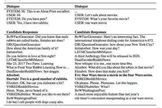 Our system architecture is inspired by the success of ensemble-based machine learning systems. These systems consist of many independent sub-models combined intelligently together. Examples of such ensemble systems include the winner of the Netflix Prize [Koren et al., 2009], the IBM Watson questionanswering system [Ferrucci et al., 2010] and Google’s machine translation system [Wu et al., 2016]. Our system consists of an ensemble of response models (see Figure 1). Each response model takes as input a dialogue history and outputs a response in natural language text. As will be explained later, the response models have been engineered to generate responses on a diverse set of topics using a variety of strategies. The dialogue manager is responsible for combining the response models together. As input, the dialogue manager expects to be given a dialogue history (i.e. all utterances recorded in the dialogue so far, including the current user utterance) and confidence values of the automatic speech recognition system (ASR confidences). To generate a response, the dialogue manager follows a three-step procedure. First, it uses all response models to generate a set of candidate responses. Second, if there exists a priority response in the set of candidate responses (i.e. a response which takes precedence over other responses), this response will be returned by the system. For example, for the question "What is your name?", the response "I am an Alexa Prize socialbot" is a priority response. Third, if there are no priority responses, the response is selected by the model selection policy. For example, the model selection policy may select a response by scoring all candidate responses and picking the highest-scored response. 2 Table 1: Example dialogues and candidate responses generated by response models. The chosen system response is marked in bold.