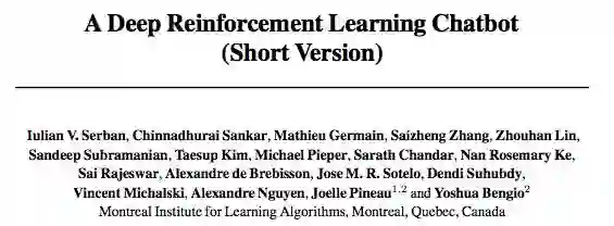 Conversational agents - including chatbots and personal assistants - are becoming increasingly ubiquitous. In 2016, Amazon proposed an international university competition with the goal of building a socialbot: a spoken conversational agent capable of conversing with humans on popular topics, such as entertainment, fashion, politics, sports, and technology.3 This article describes the experiments by the MILA Team at University of Montreal, with an emphasis on reinforcement learning. Our socialbot is based on a large-scale ensemble system leveraging deep learning and reinforcement learning. The ensemble consists of deep learning models, template-based models and external API webservices for natural language retrieval and generation. We apply reinforcement learning — including value function and policy gradient methods — to intelligently combine an ensemble of retrieval and generation models. In particular, we propose a novel off-policy model-based reinforcement learning procedure, which yields substantial improvements in A/B testing experiments with real-world users. On a rating scale 1−5, our best performing system reached an average user score of 3.15, while the average user score for all teams in the competition was only 2.92. 4 Furthermore, our best performing system averaged 14.5−16.0 turns per conversation, which is significantly higher than all other systems. 1 School of Computer Science, McGill University. 2CIFAR Fellow. 3 See https://developer.amazon.com/alexaprize. 4Throughout the semi-finals, we carried out several A/B testing experiments to evaluate different variants of our system (see Section 5). The score 3.15 is based on the best performing system in these experiments. 31st Conference on Neural Information Processing Systems (NIPS 2017), Long Beach, CA, USA. arXiv:1801.06700v1 [cs.CL] 20 Jan 2018 As shown in the A/B testing experiments, a key ingredient to achieving this performance is the application of off-policy deep reinforcement learning coupled with inductive biases, designed to improve the system’s generalization ability by making a more efficient bias-variance tradeoff.