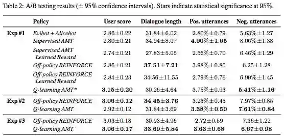 Exp #1: The first A/B testing experiment was conducted between July 29th and August 6th, 2017. We tested the dialogue manager policies Supervised AMT, Supervised AMT Learned Reward, Off-policy REINFORCE, Off-policy REINFORCE Learned Reward and Q-learning AMT. We used the greedy variants for the Off-policy REINFORCE policies. We also tested a heuristic baseline policy Evibot + Alicebot, which selects the Evibot model response if available, and otherwise selects the Alicebot model response. Over a thousand user scores were collected with about two hundred user scores per policy.6