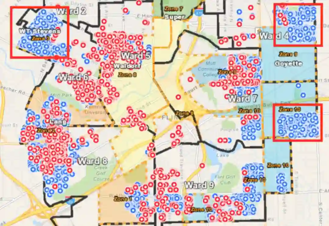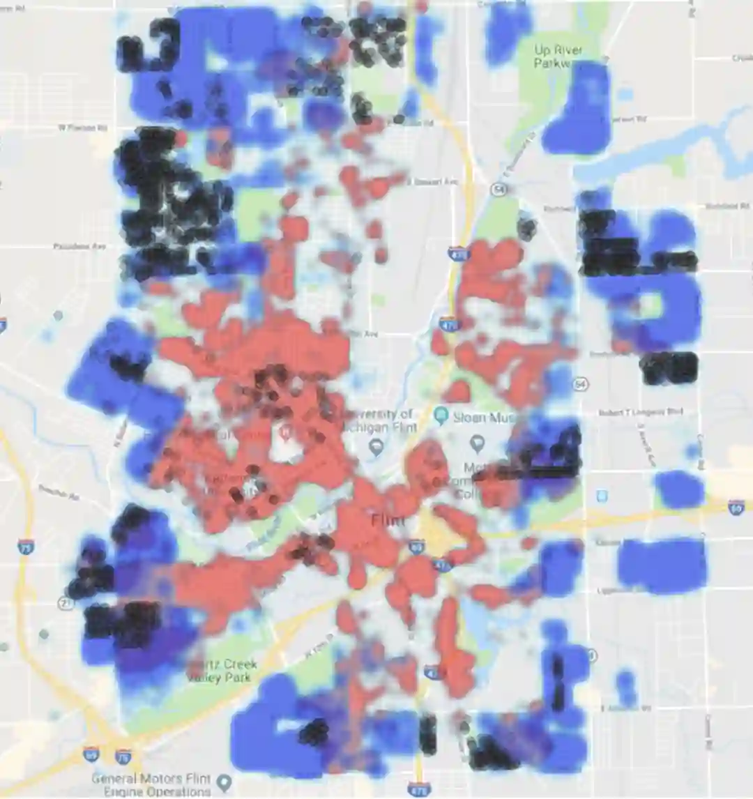 因此,在 2016 年 2 月,密歇根大学弗林特分校的 Martin Kaufman 利用城市记录绘制了一些标记铅管位置图。