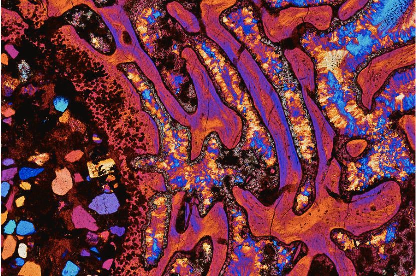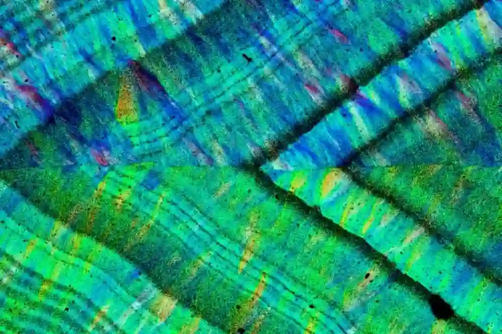 ▲ 偏振光下在美国犹他州收集的恐龙骨化石薄片