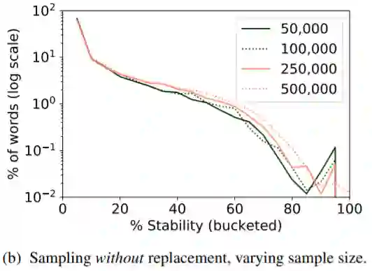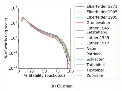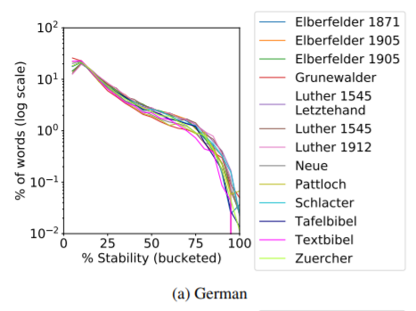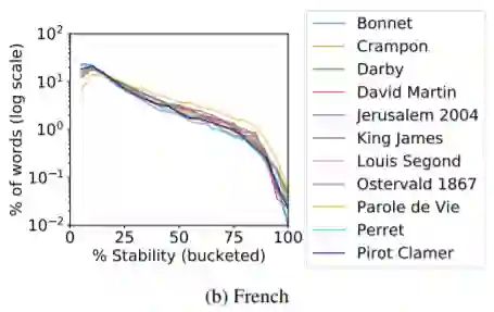 为了研究同一数据集的不同上下文对研究不同语言间稳定性的影响程度,作者分别选择了圣经在德语和法语的多个不同译本,在一个下采样数据集上用五个不同的随机数种子训练生成五个word2vec词向量,并取均值作为该译本下的词向量稳定性。可以看到除个别译文外,不同译本之间的稳定性趋势基本一致,基本可以忽略相同语义的不同上下文对词向量稳定性的影响。