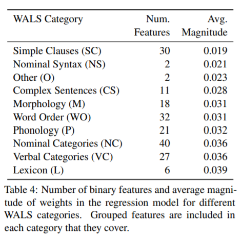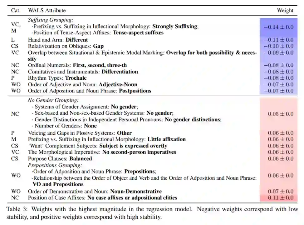 前述的实验对比了多个语言下的稳定性分布与走势,下面作者用岭回预测特定语言下的所有词的平均稳定性的方式,研究语言属性本身对词向量稳定性的影响因素。