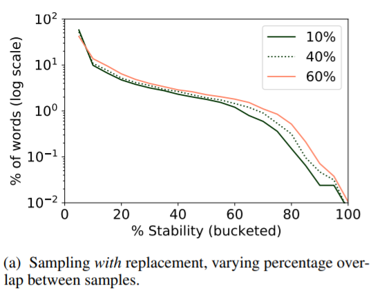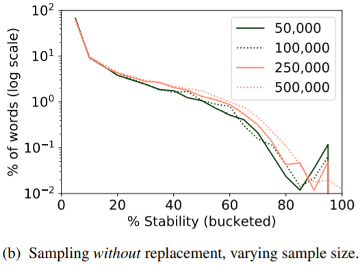 为研究不同的下采样方法对稳定性的影响,用作者的话来说,希望通过下采样得到跨语言且有可比性的稳定性结果。为此,作者专门对比了可重复采样和不可重复采样两种下采样方法对稳定性的影响。