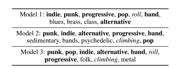 举个栗子,下面的图展示的是词“rock”在三个向量空间下最近的10个邻居词,粗体表示向量空间重叠的词,可以看到