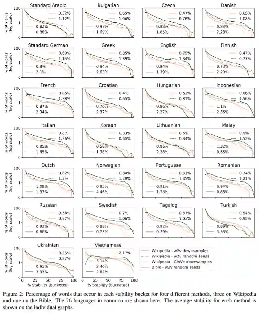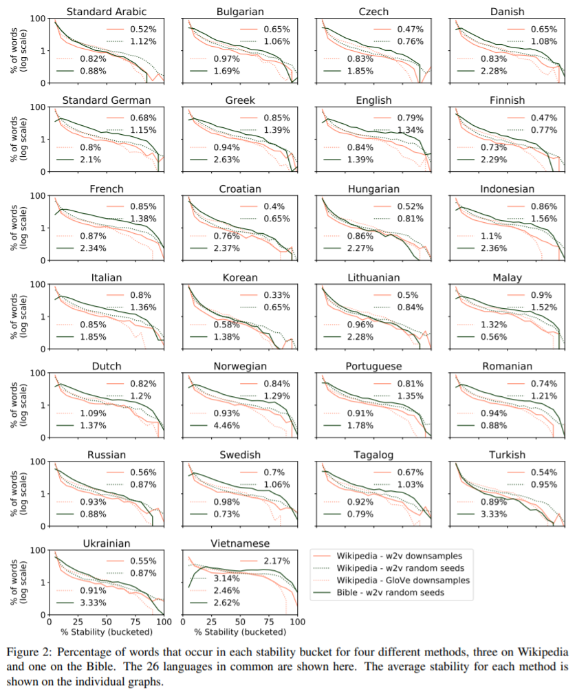 作者针对Wikipedia和Bible两个数据集重叠的26种语言,研究了不同语言,不同词向量生成算法和数据对词向量稳定性的影响,总共三种情况: