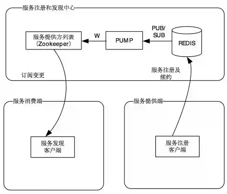 pump 订阅所有 redis 的 key space,当 redis 的 key space 发生变化时都会通知到 pump,pump 聚合所有的 Redis 数据,将提供方节点 - 服务列表信息的数据转化为服务 - 提供方节点列表的数据结构,写进 ZK。消费方获取及更新服务的服务方节点列表还是通过 ZK 来达到。