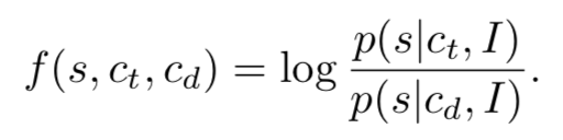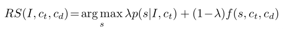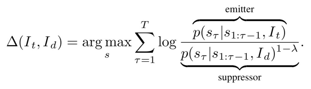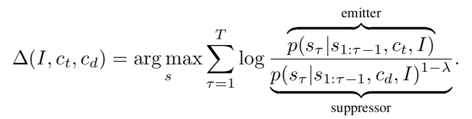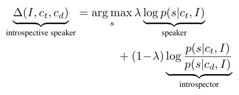 这样的 listener 建模方法只基于生成模型 G,即 speaker,作者将其命名为内省法(introspective),优点在于重用了生成模型,不引入多余的训练步骤完成了对 listener 的建模。因此公式 1 可以改写为: