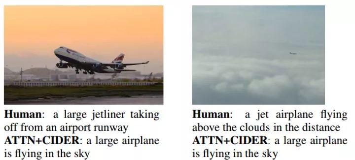 如图 1 所示,在两幅图像内容相似、但整体环境存在明显差异的情况下,人在描述的过程中能够凭直觉注意到这两幅图像的相似性,并且可以根据这种相似性给两幅图像生成细节描述对其进行区分。但目前使用交叉熵作为损失函数的方法却无法做到,其给出的描述完全一致,忽视了图像的细节特征。ATTN + CIDER 表示使用注意力机制、基于 CIDER 的强化学习方法训练模型。