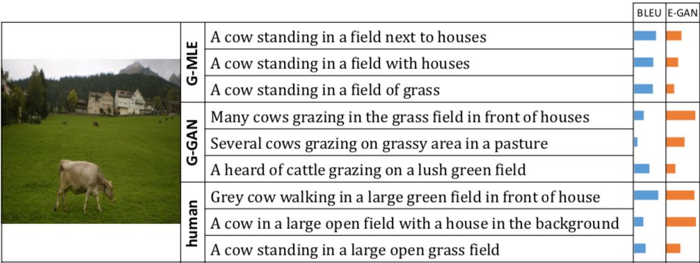 可以看出相比较于 MLE 方法,使用 GAN 生成的结果在句法结构上更加复杂,对于细节的描述非常丰富。使用 MLE 的方法导致生成结果非常死板,语句模式单一,这也是上文所提到的机器更趋向于更“安全”的结果的量化体现。