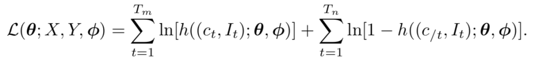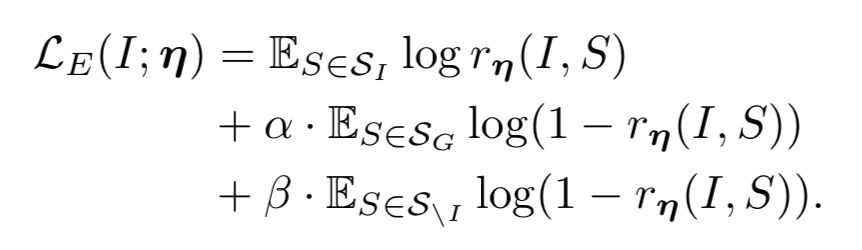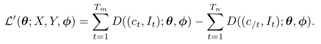 为了能够加强 E 的能力,在真实的目标函数中除了引入 I 所对应的真实结果和生成预测结果,还需要引入真实的但对应其他图片的一个结果,即总共 3 种来源不同的语句描述。目的是加强真实语句的得分,抑制其他两个来源的句子得分。这一表示形式的建模可以表示为如下公式: