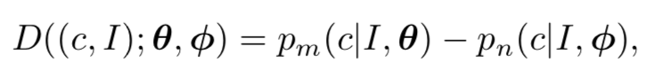 将这样的思想应用在 discriminative image caption 领域当中,对应的真实数据和迷惑数据将表示为图片,在两幅相似图片的基础下,获取对应图片的细节信息从而生成更准确的描述。具体公式表示如下: