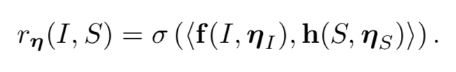 Evaluator E 也是一个神经网络,网络模型框架和 G 相似,但参数是不共享的,可以理解为结构相似、但实际不同的两个模型。E 通过给定图片和描述的正确配对,通过 CNN 和 LSTM 将其编码映射到相同的语义空间(具体方法感兴趣可以了解跨模态的图文匹配方法),将其点乘根据 logistic function 得到一个 [0,1] 的概率值表示得分,详细公式如下: