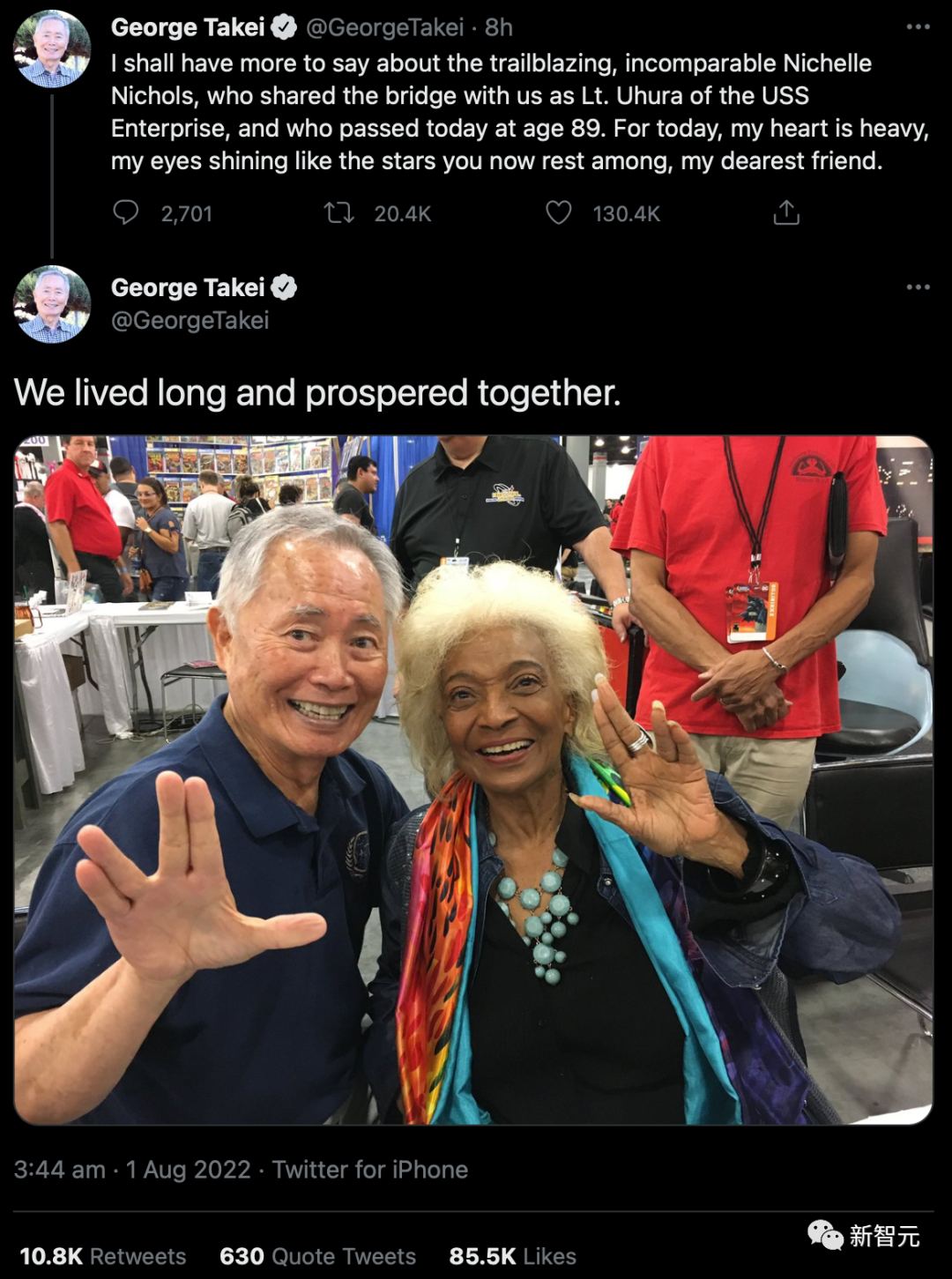 以在《星际迷航》中扮演Hikaru Sulu一角而闻名的George Takei,也在推特上向Nichols致敬。「关于开创性的、无与伦比的Nichelle Nichols,我有很多话要说。她作为USS Enterprise 的 Lt. Uhura与我们共享这座桥。她今天去世了,享年89岁。」Takei说。「今天,我的心情很沉重,我的眼睛闪着泪光,就像你现在正休憩的星星一样,我最亲爱的朋友。」