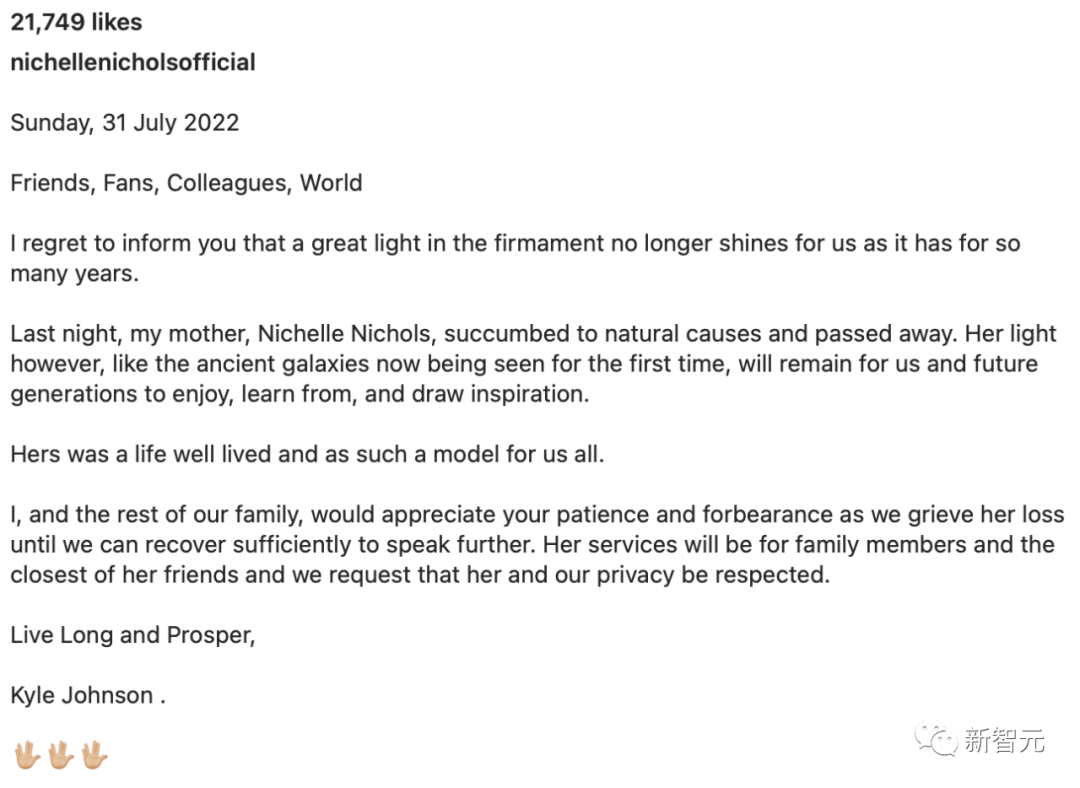 「昨晚,我的母亲Nichelle Nichols死于自然原因并去世了,」约翰逊写道。「然而,她的光芒,就像我们第一次看到的古老星系一样,将永远留给我们,让我们和后代一起享受、学习和汲取灵感。」