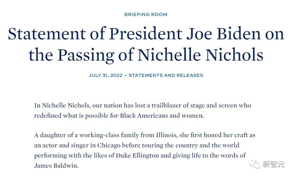 美国总统、Nichols的同事和演员在网上纷纷表示了怀念和哀悼。