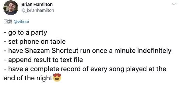参加聚会 —— 把手机放在桌子上 —— 打开一个循环运行的 Shazam 快捷指令 —— 将听到的歌曲结果自动保存在本地文本中 —— 这样就能白嫖到一堆好歌了。