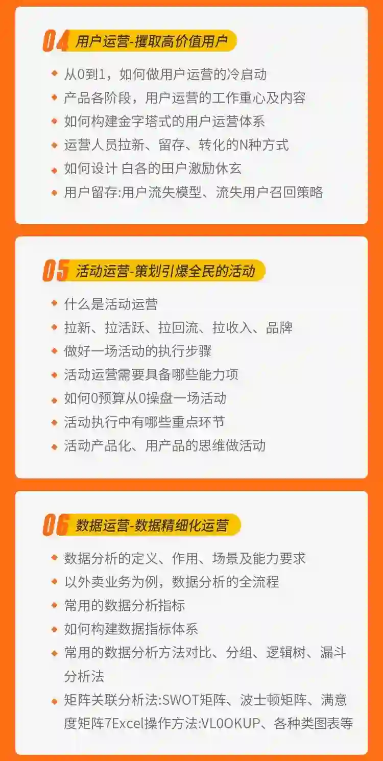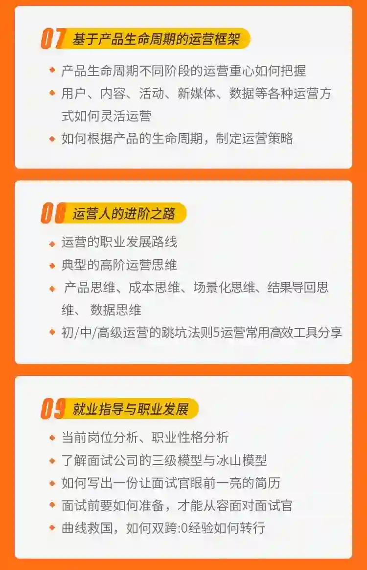 能帮你从0-1搭建成为高薪运营人所需要的知识体系,成为能全流程掌握、全业务熟悉的运营人,更加契合大厂招聘需求。