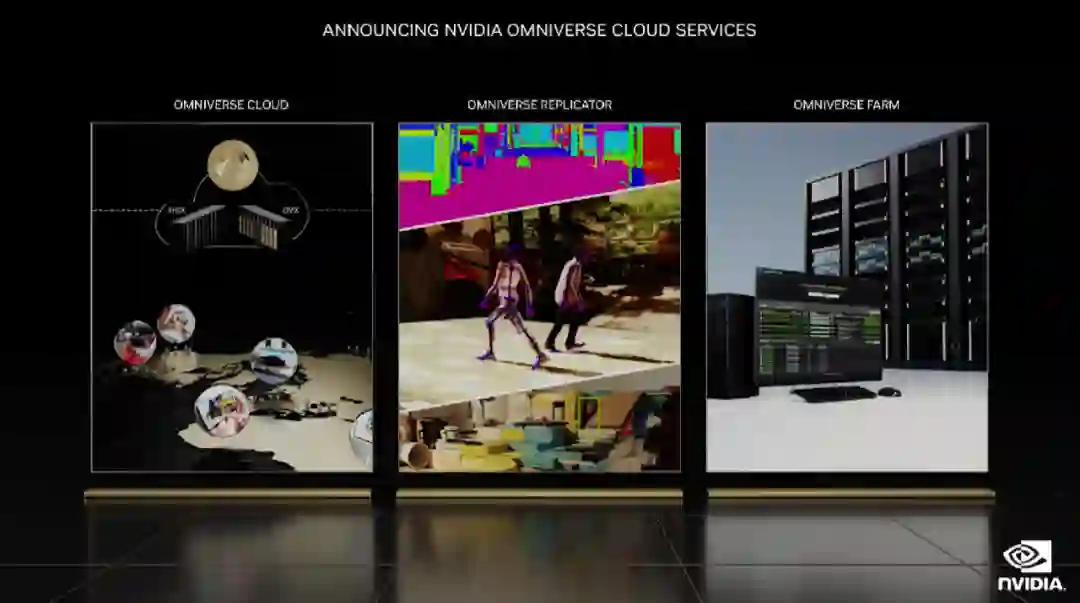 黄仁勋表示,NVIDIA Omniverse Cloud 是一款 IaaS 产品,可以连接在云上、本地和单个设备上,运行 Omniverse 应用。Replicator 和 Farm 也可以在云上运行,其中 Farm 是渲染农场的扩展引擎。目前,用户可以在 AWS 上使用 Replicator 和 Farm 容器。